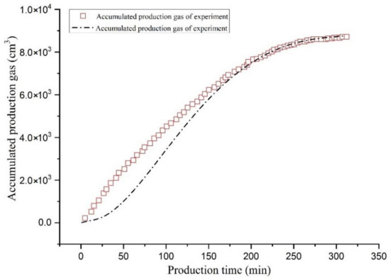 Figure 4 shows the accumulated production gas of simulation and experiment. It shows that in the initial stage of decomposition, the gas production rate of the simulation result is slightly lower than the experimental measurement value. After 50 min, the gas production rate of the simulation result gradually increases, and the total gas production of the final simulation result is basically equal to the total gas production of the experiment result. The comparison has shown a consistent result of simulation and Masuda’s experiment, which indicates that the simulation model used in this study is validated.