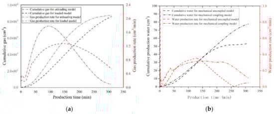 Figure 5a shows the cumulative gas and gas production rate variation with production time. Since there are free gas and water in the initial status of both the mechanical uncoupled model and mechanical coupling model, the gas production rate shows an increment at the beginning of production, then reduces for the rapid consumption of free gas. The system pressure decreases gradually with the discharge of free gas and water. When it reaches the NGH equilibrium pressure, the NGH begins to decompose to supplement the gas source. Then the gas production rate keeps a constant growth over a long production time with nearly 80 min by the mechanical coupling model and 110 min by the mechanical uncoupled model. A significant difference in gas production rate is shown for these two models; the growth and decline magnitude of gas production rate for the loading model are relatively small compared to that of the mechanical uncoupled model, which indicates that the sediment deformation would restrain the decomposition of NGH and leads to the extension of production time.