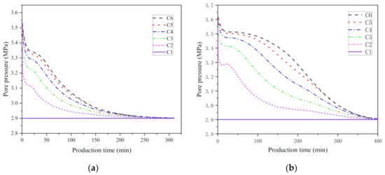 Figure 6a,b shows the pore pressure variation with production time for the mechanical coupling and uncoupled models at C1 to C6, respectively. The pore pressure of C1 is equal to outlet pressure since it locates at the pressure outlet boundary. For the initial stage of the gas production, the free gas and water are discharged out of the reactor rapidly, leading to the pore pressure dropping significantly faster than other stages for both mechanical coupling and uncoupled models. There is an obvious pore pressure rebound point after the rapid dropping stage, which is caused by the balance of NGH decomposition and fluids discharge. The pore pressure rebound point for the mechanical uncoupled model appears about 15 min after depressurization, about 10 min earlier than that of the loading model. Meanwhile, the pore pressure at the pressure rebound point is related to the location of the monitory point for the same model. The further the monitory point to the pressure outlet and the higher the pore pressure at the pressure rebound point are, the longer the rebound duration is. Compared to the mechanical uncoupled model, the pore pressure of all monitory points at the pressure rebound points is higher, and the pore pressure drop rate is significantly lower in the mechanical coupling model. It costs about 300 and 400 min for pore pressure to drop to the outlet pressure at the bottom of the cylinder for the mechanical uncoupled and coupling models, respectively. It is shown that the sediment deformation may promote the occurrence of overpressure in sediment pores.