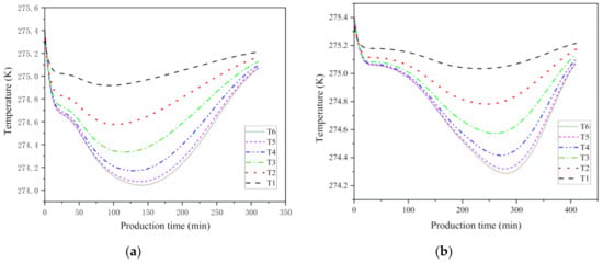 Figure 7 shows the temperature variation with a production time at points T1 to T6 for the mechanical coupling and uncoupled models at monitoring points T1 to T6. With the consumption of hydrate-bearing sediment sensible heat by NGH decomposition, the reservoir temperature reduces rapidly. Since the gas production rate for the mechanical uncoupled model is significantly larger than that of the mechanical coupling model at the initial production stage, the system temperature reaches the minimum temperature of 274 K at a production time of 150 min for the mechanical uncoupled model, which is ahead of 150 min than that of the mechanical coupling model with the lowest temperature of 274.3 K. With the ambient heat transfers into the model, there is a slow rise in system temperature until it reaches to the ambient temperature. It indicates that the gas production process is significantly influenced by ambient temperature. Although this influence exists widely in NGH production tests at both the laboratory and field scale, it is more dramatic for small scale models. However, most gas production tests on a laboratory scale neglect this influence, leading to the overestimation of gas production effects.