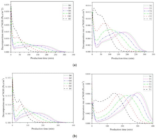 Figure 8 shows NGH decomposition rate variation with production time for the mechanical Figure 8a uncoupled and Figure 8b coupled models at monitoring points B1 to B6 and T1 to T6, B1 to B6 corresponding to the top of the model and T1 to T6 corresponding to the bottom of the model. B1 to B6, which are closer to the pressure outlet, have a high NGH decomposition rate for the rapid drop of pore pressure near the outlet. Since the equilibrium pressure of NGH is temperature-dependent, as mentioned former, with the decrement of model temperature caused by sensible heat consumption, the equilibrium pressure of NGH also drops, which leads to the slowdown of NGH decomposition rate for both mechanical coupling and uncoupled models. In the later stage, the model temperature rises for heat absorption from around the environment, giving rise to the improvement of NGH equilibrium pressure and corresponding to the NGH decomposition rate increment.