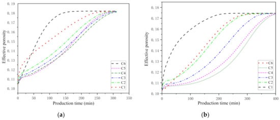 Figure 9 shows the effective porosity variation with production time for the mechanical (a) uncoupled and (b) coupled models. Generally, the effective porosity of hydrate-bearing sediment is considered as a hydrate saturation related parameter, which is increased with the reduction of hydrate saturation, as shown in Equation (8). With the help of ambient heat, the NGH in the mechanical coupled model decomposes completely, which leads to the effective porosity reaching the initial defined absolute porosity of 0.18. The sediment deformation causes a significant decrease of the effective porosity, as shown in Figure 9b, and the final effective porosity of the mechanical coupling model is 0.174.