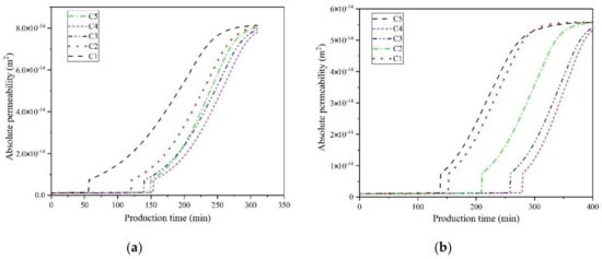 Absolute permeability variation with production time for mechanical (a) uncoupled and (b) coupled models.