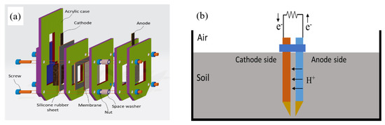 Figure 1a shows the structure of the proposed PSMFC. The reactors were made of acrylic boards with external dimensions of 7.5 cm height 4.0 cm width 2.5 cm thickness. The cathode chamber was separated from the anode chamber by a PEM. A perfluorinated polymer membrane (Nafion PEM) was selected due to its high protonic conductivity and low equivalent weight [19]. The cathode chamber was enclosed to prevent the soil water from penetrating. A small hole was opened at the top (this part was out of the soil) of the cathode chamber to expose the cathode to the open air. Carbon-based materials were used for both the anode and cathode electrodes.
