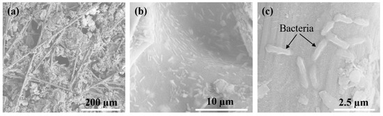 The surface morphology of the surface of the anode electrode was examined by SEM. As shown in Figure 3a, the anodic electrode’s surface was porous with layers of clustered particles of activated carbon attached to carbon fibers and cellulose fibers. Although the preparation process of the samples for SEM measurement may significantly remove many cells attached to the surface of the anode, the SEM images at high magnification clearly showed biofilms of bacteria on the surface (Figure 3b,c). Previous studies have reported that a higher microporous surface could improve the biofilm formation on the anode, leading to higher current generation and power density [20,21].