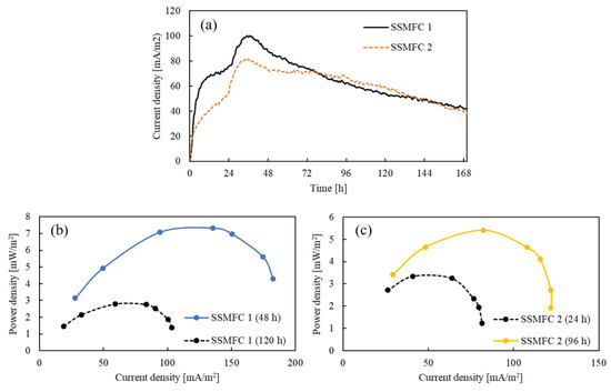 Moreover, the power densities of the PSMFC1 and PSMFC2 were measured and are shown in Figure 4b,c, respectively. The results showed that the power density of the PSMFC1 measured at 48 h was 7.3 mW/m2, and that of the PSMFC2 measured at 24 h was 5.4 mW/m2. These results are in good agreement with the polarization curves shown in Figure 4a.