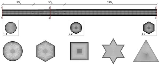 As was mentioned before, the simulations were performed using a two-stage approach. In the first stage, the ANSYS Fluent LES solver was used to model the flow within each investigated nozzle. A view of the computational mesh applied on the nozzles is presented in the upper part of Figure 1. Each nozzle is comprised of a straight rod with a length of 25 and starts with a circular cross-section (up to 5), which smoothly converts into the final shape over a distance of 5 (see Cross-section 2-2 in Figure 1) and then continues up to a distance of 15. The computational meshes generated inside the pipes were block-structured and precisely matched the inner wall shape of each nozzle, i.e., circular, hexagonal, square, hexagram and triangular, as can be seen in the lower part of Figure 1. The computational meshes were discretized to achieve the near-wall cell height for a proper resolution of the turbulent boundary layers developing in the pipes.