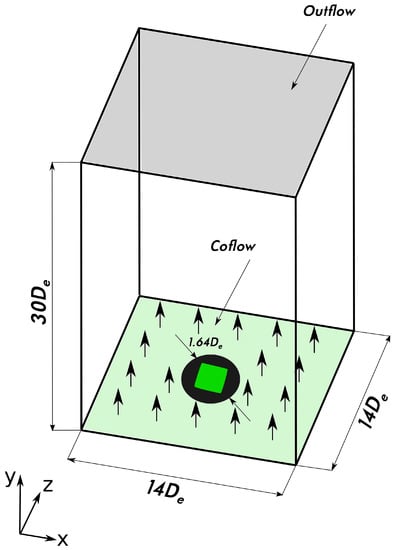 The research on the impact of fuel nozzle geometries on reactive flows was mainly conducted experimentally. Historically, Gutmark et al. in [8,9] studied the dynamics of jet burners with corners. In the latter work, it was found that their effect on jet dynamics was similar to cold flows. The small-scale structures emanating from sharp corners were shown to interfere with the large-scale structures originating from the flat sides. These combined effects were found to be beneficial for combustion. A comprehensive review of earlier works focusing on passive combustion enhancement can be found in [10]. Iyogun et al. [11] investigated the flames issuing from five types of nozzles, i.e., circular pipe, contracting circular, triangular, rectangular and square. Compared to the circular nozzle, it was found that polygonal nozzles reduced the flame lift-off height () and increased the blow-off velocity. It was reported that nozzle shape is important mainly at low Reynolds numbers and that is reduced the most in the case of the square nozzle. Akbarzadeh et al. [12] analysed the effect of nozzle geometry on of methane flames for a wide range of Reynolds numbers (). In the non-circular nozzles, the Reynolds number is usually defined as with denoting the jet bulk velocity, the fuel kinematic viscosity and the equivalent diameter of a virtual circular jet with the cross-section area equal to the actual area of the non-circular nozzle S. Combustion in rectangular jets was investigated experimentally also in [13]. The jets varied between 300 and 2046, and two different jet aspect ratios and 36 were taken into account. The flame in the burner with exhibited an attached, transitional or lifted flame mode depending on the co-flow velocity. It was found that the higher AR promotes entrainment and mixing in the flame stabilisation region, whereas the flame with the lower AR enhances mixing at the flame edges. The unique features of high AR flame presented overall better combustion performance due to the mixing enhancement. These findings along with the improved stability of the jets emanating from rectangular compared to circular nozzles were also confirmed in [14]. A series of experiments [15] were performed for the rectangular nozzles with aspect ratios ranging from 5:1 to 50:1. It was shown that the increased aspect ratio reduces in response to the enhanced mixing and increased entrainment in the near-field. Recently, Liu et al. [16] investigated the effect of four different nozzle geometries on the flame shape, flame mean length and blow-out limit under cross-wind conditions. The authors found, among others, that the blow-out limit was slightly affected by nozzle geometry for a low jet velocity and, conversely, significantly influenced as the jet velocity increased. The blow-out velocity was found to be the maximum for the triangle nozzle and the minimum for the rectangular one.