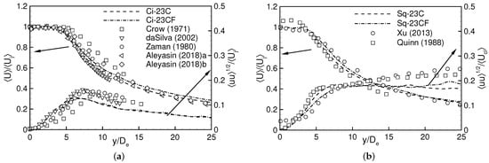 In Figure 3a, the LES results obtained for the circular nozzle on the coarse (Ci-23C) and fine mesh (Ci-23CF) are compared with the LES results obtained by da Silva and Métais [37] (Re = ) and the experimental data of Crow and Champagne [38] (Re = ), Zaman and Hussain [39] (Re = ) and Aleyasin et al. [40] ((a) and (b)), who analysed the jet dynamics in the range . As was previously reported by Ball et al. [41], they confirmed that in circular jets, the impact of the Reynolds number on the mean velocity decay and the potential core length was weak when . In fact, their results for and were very close to each other. The discrepancies between the results reported by different authors originated from the differences in the details of nozzles (e.g., nozzle length or contraction) and the inlet turbulence characteristics (e.g., turbulence intensity, turbulent length scales) rather than from the Reynolds number. In general, the agreement of the mean velocity profile with the literature results was satisfactory, especially with the data reported by Aleyasin et al. [40] for 20,000. This is most likely because the turbulence intensity distribution at the nozzle exit was in this case very similar to that in the present work. Regarding the velocity fluctuations, up to a distance of , the agreement between the present simulation results and experimental data was very good. Further downstream, the simulation results seemed to slightly underestimate the velocity fluctuation level, which was caused by the fact that in a fully turbulent flow region, a portion of the energy was contained in the unresolved sub-grid flow scales interacting with discretization errors [42].