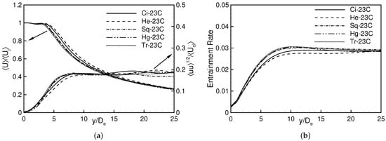 Figure 4b shows the entrainment rate, which is a measure that allows quantifying the mixing of the fluid from the surroundings into the jet. The mixing efficiency plays a key role in combustion devices, i.e., burners, combustion chambers, etc. Enhanced mixing allows faster fuel conversion and hence makes the devices more compact. In this study, following Wygnanski and Fiedler [46], the entrainment rate is computed as: