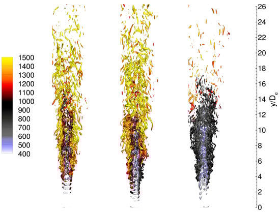 Q-parameter isosurfaces coloured by instantaneous temperature values. The results were obtained for the triangular nozzle (cases Tr-18H, Tr-20H and Tr-23H from left to right, respectively).