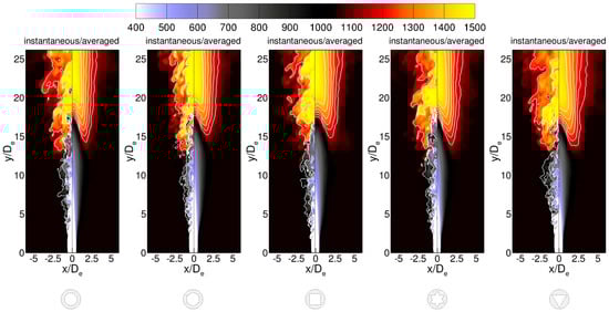 The instantaneous and time-averaged temperature contours for 23,600 are presented in Figure 6. Following Stankovic et al. [47], the lift-off height is defined as the location of the first occurrence of the OH species with the mass fraction above the value . values are equal to and 13.59 for the triangular, hexagram, circular, hexagonal and square nozzles, respectively.