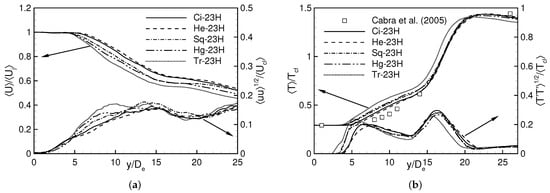 As by visual inspection of the temperature contours, it is hard to grasp much of a difference between the jets, we present the distributions of the time-averaged velocity and temperature with their fluctuations along the jet axis in Figure 7. One of the conclusions drawn from the non-reactive cases was that the use of the triangular nozzle results in the highest entrainment rate. This is also true for the reactive case. As can be seen in Figure 7a, the triangular jet shows the fastest decay of the axial velocity along the axis. The square and hexagram nozzles also show a stronger velocity decay rate in comparison to the circular and hexagonal nozzles. Regarding the time-averaged temperature along the axis (see Figure 7b), one can notice that the results for the triangular nozzle case again differ from other results. Enhanced mixing leads to a quicker transport of the co-flow gases to the jet region and an increase of the temperature in the jet axis. This effect can also be seen for temperature fluctuations. In all cases, there are two peaks: the first peak is related to the location where the inert mixing with co-flow occurs, whereas the second one is observed in the region where the chemical reactions take place. Both peaks for the triangular case are shifted towards the nozzle exit, which indicates faster mixing and shorter flame lift-off height. The symbols in Figure 7b denote the experimental data of Cabra et al. [36], which can be compared with the case Ci-23H. Although in the present configuration, the nozzle is surrounded by the thick wall, the agreement is very good. This concerns both the region of the fuel/oxidizer mixing in between 5–15, where the temperature increases almost linearly, and the fully burning regime in the far-field , where the flame behaviour is less dependent on the inlet conditions and the temperature is very high.