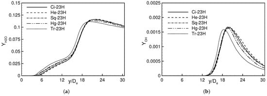 Figure 8a,b show the axial distribution of the H2O and OH species’ mass fractions. The profile of the H2O species shows that up to , its level increases, though the combustion does not occur in this region yet. In such a case, the H2O species can originate only from the co-flowing stream, and therefore, it can be used as a measure of mixing in the jet axis. It turns out to be the most intense for the jet issuing from the triangular nozzle. Further downstream, from around , a rapid increase of the H2O species is observed. The fact that it rises in an analogous way as the temperature values (see Figure 7b) confirms that at this particular location, the chemical reactions are initiated. Analysis of the OH mass fraction shows that a direct consequence of the intensified mixing is that the auto-ignition and the reaction zone occur closer to the inlet. Compared to the remaining cases, the peak of OH mass fraction for the case Tr-23H is shifted upstream from to .