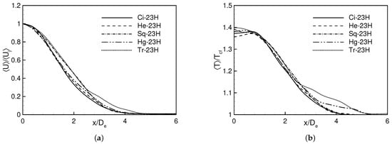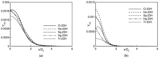 Larger differences are found in the species distributions. The radial profiles of the mass fractions of OH and H2 at the location are presented in Figure 10a,b, respectively. The concentration of OH seems to differ only near the jet axes, while for , the profiles converge to virtually the same value. This is also the case for the H2 species, though, in this case, the differences between particular solutions are more pronounced. This is especially noticeable near the axis where for the triangular nozzle (Tr-23H) hydrogen mass fraction is much smaller than in the remaining cases, almost five times compared to the hexagonal jet (He-23H). This is related to the following facts: (i) in the case Tr-23H is the shortest, and this causes hydrogen at the jet periphery to start to be consumed by the reaction closer to the nozzle; (ii) the velocity in the case Tr-23H decays the fastest (see Figure 7a) as a manifestation of the most intense mixing. This translates into the fastest rise of temperature in the mixing zone in the region of (see Figure 7b). The small level of H2 at results from the combined effect of the chemical reactions that started earlier and the mixing with the co-flow that dilutes the fuel in the centre of the flame.