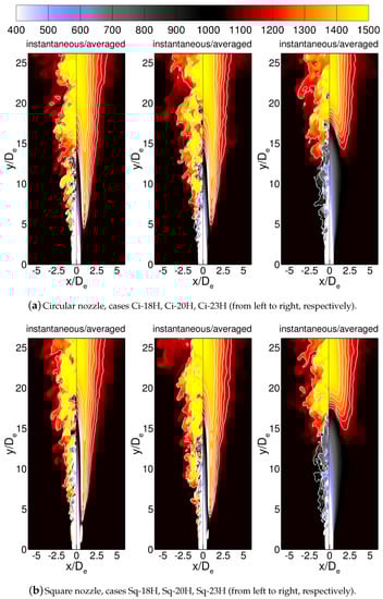 The differences in the results obtained for 23,600 are mainly quantitative and not as substantial as one could expect taking into account the evident differences in the nozzle shapes. This is consistent with the observations of Iyogun et al. [11], who reported that nozzle shape is important mainly at low Reynolds numbers. The results for 18,000 and 20,000 are presented only for the circular, square and triangular nozzles that suffice to show how the flames respond to changes in and which of them are more prone to such changes. Figure 11 shows the instantaneous and time-averaged temperature distributions for all three Reynolds numbers. The first thing that can be noticed is that decreasing the Reynolds number from 23,600 to 20,000 leads to a drastic change in . It is reduced from to (cases Ci-23H → Ci-20H), from to (Sq-23H → Sq-20H) and from to (Tr-23H → Tr-20H). This is somewhat surprising since in the case Tr-23H, the was the shortest, while for Tr-20H, it was the highest.
