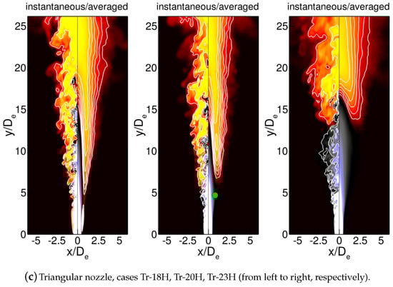 The analysis of the results obtained using the circular nozzle (Figure 11a) reveals that the reduction of the Reynolds number from 23,600 to 20,000 (Ci-23H → Ci-20H) resulted in a drastic change of . However, reducing the Reynolds number to 18,000 did not lead to any substantial differences in . On the other hand, reducing the Reynolds number for the jets issuing from the square and triangular nozzles (cases Sq-20H→Sq-18H and Tr-20H→Tr-18H) causes remarkable differences, as can be seen in Figure 11b,c. First of all, one can observe that in these cases, the flames are discontinuous. They are almost attached to the nozzle; however, further downstream, they are extinguished, and the new flame fronts are formed in close vicinity. Most likely, this is the effect of the small-scale mixing between the cold fuel stream and hot oxidiser. It could be seen in Figure 5 that deformed toroidal structures appear in this region. Close inspection of the results shows that they rotate in a way that the cold fuel from the jet core is transported outside the jet region causing local blow-off of the flame formed in the closest proximity of the nozzle. Note that for 20,000, this phenomenon occurs also for the square nozzle, but not for the triangular one. This shows how much the lift-off height and flame stability in its initial phase are sensitive to the inlet conditions, both related to the flow parameters, as well as to the nozzle shapes, particularly their corners. The regions of an intense reaction and unsteady flame behaviour caused by corners were observed also in [8,19].