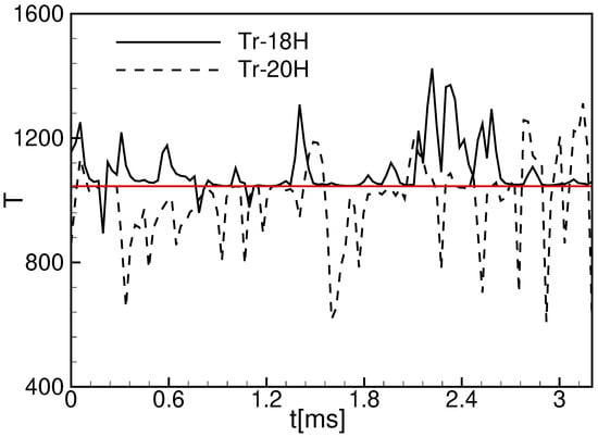 To further investigate the flame discontinuity, a temporal evolution of the temperature was measured at a single point P (coordinates: ) shown in the middle of Figure 11c as a green circle. Its location corresponds to the anchoring point of the flame above the gap that is seen in the time-averaged results for the case Tr-18H. The recorded time signals for the cases Tr-18H and Tr-20H are presented in Figure 12 where the red line denotes the co-flow temperature. As one can see, temperature variability is large, and depending on the Reynolds number, it rises more or less frequently above . The distinct peaks denote the time instances when, due to the chemical reactions, the heat release is large. Evidently, more such points are observed for the case Tr-18H. For Tr-20H, they appear rarely, and in this case, the temperature is mostly below . In effect, only in the case Tr-18H, the time-averaged temperature at the point P indicates the occurrence of ignition.