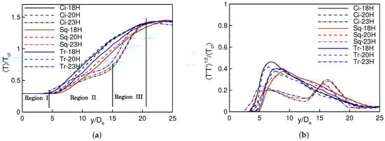 The temperature fluctuations along the jet axis shown in Figure 13b reflect the differences observed in the mean temperature profiles. Two distinct peaks can be observed for 23,600. The first one is located at , i.e., in between the regions (I) and (II). Note that before the first maximum is reached, the temperature fluctuations grow the fastest for the triangular cases, which seems to confirm their ability to improve the mixing process the most. The second maximum occurs at , which can be related to the beginning of the zone inside the region (III) where . These peaks correspond to the borders between different mixing/reaction regions discussed above. For 20,000 and 18,000, the fluctuations exhibit significantly different behaviour. Only single peaks are seen at locations 6–8, and their levels depend on the Reynolds number and nozzle shape. The maxima change in the following orders: Tr-20H, Ci-20H, Sq-20H and Ci-18H, Tr-18H, Sq-18H. The former sequence coincides with the order at which the mean temperature grows, while the latter does not. This supports a common view that the instantaneous flame dynamics, the strength of which is often expressed in terms of temperature fluctuations, cannot be one-to-one related to the mean temperature field.