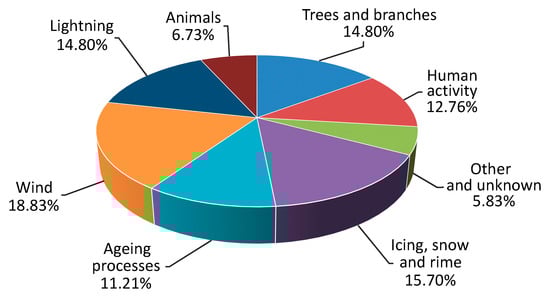 Factors that have a major impact on the failure of power systems are environmental exposures. Their impact on the operational properties of structures has been known for a long time. As early as in the 1950s and 1960s, standardisation acts on environmental testing were established in many countries to check whether a structure would be able to carry out its tasks undisturbed if certain environmental exposures were encountered at a certain intensity and for a certain period of time. Currently, there are few studies on the impact of environmental conditions (e.g., climatic conditions) on the operation of power systems in the scientific and technical literature [,]. Much more often, the influence of weather on the variability of electrical loads [] or the production of energy in renewable sources (photovoltaic and wind power plants) is analysed, e.g., [,,,]. If studies on the influence of environmental factors on the failure of power systems are already carried out, two aspects are usually taken into account: the impact of temperature and the total impact of other environmental exposures [,,,]. Meanwhile, as the statistics of power equipment failure show, the effects of such factors as lightning, wind, air humidity, icing and rime are very high. It is therefore necessary to carry out detailed analyses and independently examine the impact of particular factors on the occurrence of damage to power grid structures. A serious problem that may arise in this case is, as already mentioned, the lack of reliable data on the basis of which such an analysis could be conducted. In the official statistics of failure conducted by distribution companies, the environmental factor is very rarely indicated as the cause of damage (except for lightning, icing and rime). Electrical fitters who repair faults in power grids usually do not have enough knowledge to recognize the failure mechanism of a device. Therefore, very often, they enter enigmatic statements such as “ageing processes” or “cause unknown” as the cause of damage in the failure report.