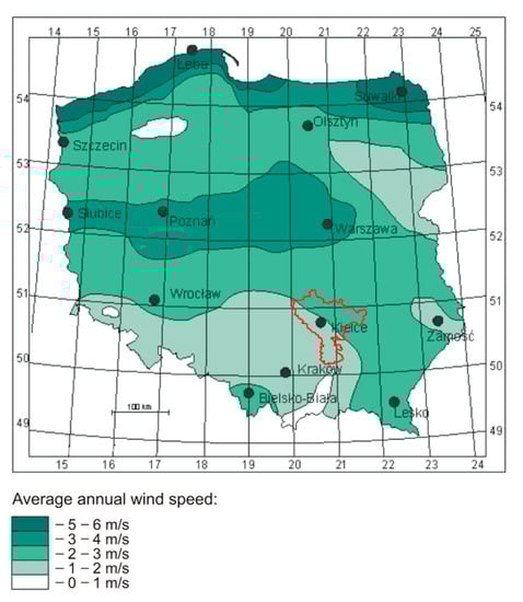 Figure 2 marks the area covered by the research. According to standard [], this area belongs to wind zone W1.