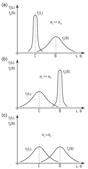 Functions of load (exposure) probability density fL(L) and element’s strength fS(S) for the three cases of their relation under consideration (cases (a–c) are discussed in the text).