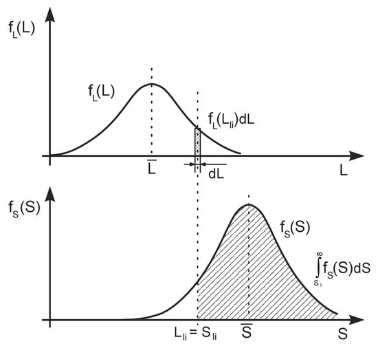 The issue is much more complex for the case presented in Figure 3c. In this situation, consideration should be given to the mutual location of the probability distribution of the individual load and strength values of a structure. The probability that the load of a structure will not exceed its momentary strength is the probability of the simultaneous occurrence of two independent events (Figure 4), i.e.: