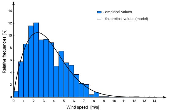 After substituting the determined values into Equation (15), the theoretical function of the probability density of occurrence of winds of different speeds takes the form: