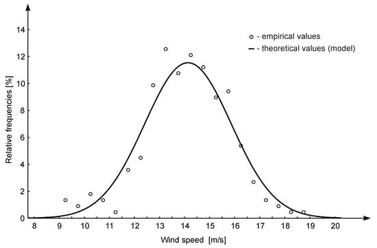 On the basis of empirical data covering a ten-year period of observation of 110 kV overhead lines, failure tests of these structures were also carried out depending on wind speed at the moment of damage. On their basis, a probability density function of 110 kV overhead lines strength (resistance) to an external factor (exposure), i.e., wind, was determined. Empirical data had to be standardised for this purpose because the lengths of the time intervals for the occurrence of individual wind speeds are not the same. The standardization methodology is presented in detail in []. Due to the fact that the lines are of different lengths, the parameters and reliability indicators were compared to the arbitrary length of 100 km of lines. The empirical values and the theoretical probability density function of the 110 kV line resistance to load, which is wind speed, are shown in Figure 6.