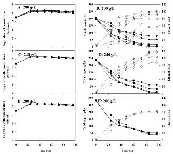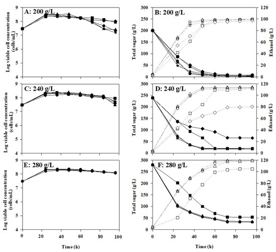 Cell viability (A,C,E), sugar consumption (B,D,F: solid lines) and ethanol production (B,D,F: dashed lines) during batch ethanol fermentation from SSJ media containing initial sugar of 200 g/L (A,B), 240 g/L (C,D) and 280 g/L (E,F) and urea at 1.54 g/L; SCJ04KKU (