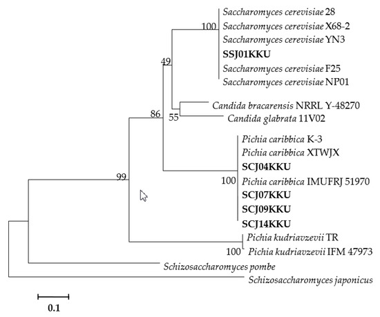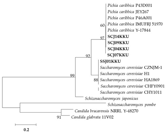 After primary isolation of each isolate using morphological characterization, their molecular taxonomy was investigated using nucleotide sequence determination of the D1/D2 domain and the ITS1 and ITS2 regions [28]. Kurtzman and Robnett [28,29] characterized ascomycetous yeast nucleotide divergence in the D1/D2 variable region of the 26S rDNA. The degree of divergence was sufficient to resolve nearly all ascomycetous species. The ITS1 and ITS2 regions are useful for phylogenetic analysis of closely related species. Since both the non-coding ITS regions and the 5.8S are quite variable and show high interspecific divergence [30], sequence analysis of these regions has thus been useful for differentiation of species within Saccharomyces [31]. In the present study, SSJ01KKU was identified as S. cerevisiae, and SCJ04KKU, SCJ07KKU, SCJ09KKU and SCJ14KKU strains were identified as Pichia caribbica, based on clusters defined by the tree nodes with high bootstrap support. The bootstrap percentages indicate the reliability of the cluster descending from that node. (Figure 4). Similarly, phylogenetic analysis of the internal transcribed spacer 1 and 2 regions (ITS1 and ITS2) was in good agreement with the results of the D1/D2 domain, confirming the molecular identification of all isolates. (Figure 5). Based on the morphological and molecular data, including its unique geographical origin, SSJ01KKU as an accession number KU 059,757 from GenBank is a novel effective yeast strain of S. cerevisiae, which can grow and produce ethanol effectively under both HG and VHG conditions, yielding ethanol up to 15% (v/v). In addition, SCJ04KKU (accession number KU 059758), SCJ07KKU (accession number KU 059759), SCJ09KKU (accession number KU 059760) and SCJ14KKU (accession number KU 059761) were novel yeast strains of Pichia caribbica.