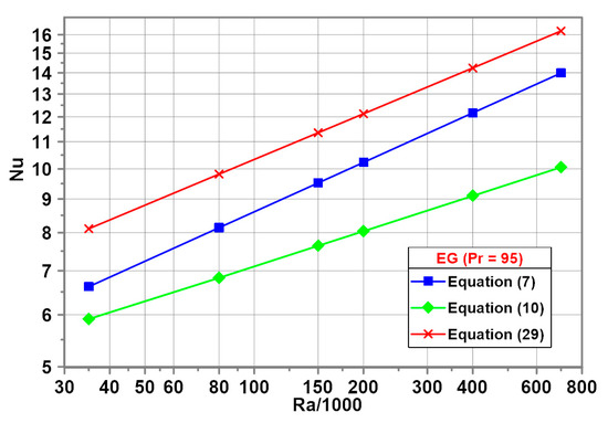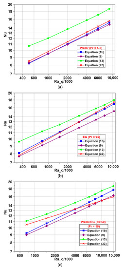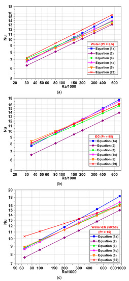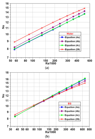 A different case is observed for pure EG (Figure 5b). For the minimum Ra number, except for the Fand and Brucker correlation equation (Equation (5)), other correlation equations (Equations (1a), (2), (3) and (4c)) underestimate the predictions from Equation (29) with a maximum deviation of 19% (Equation (2)). For the maximum Ra number tested, correlations proposed by Churchill and Chu (Equation (1a)) and Fand et al. (Equation (4c)) overestimate the predictions from Equation (29) by about 8% and 4.8%, respectively. The correlation equation proposed by Kuehn and Goldstein (Equation (3)) reproduces the present experimental data quite well with an average deviation of about 3%.