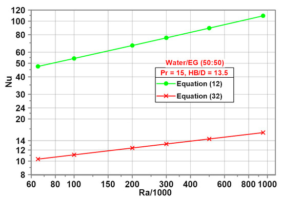 For the water/EG (50:50) mixture (Figure 6c) only the Abou-Ziyan et al. correlation (Equation (13)) overestimates predictions from the developed Equation (33) within the whole range of Ra numbers with a difference of 5.7% for the minimum Ra number and 17.5% for the maximum Ra number.
