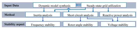 In addition to steady-state analyses, the dynamic properties must be assessed to evaluate the stability of power systems and, thus, their reliability. To this end, the full generation and load time series is assessed after congestion management. Classically, power system stability is divided into frequency stability, rotor angle stability, and voltage stability [36]. These stability aspects are the focus of our work. To investigate these aspects, three different methods are applied (Figure 2). Note that these methods only enable an indicative stability study since no detailed time-domain simulations are carried out.