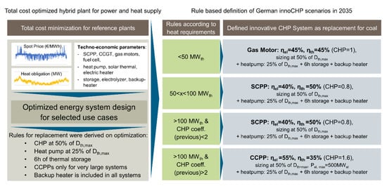 The design of each of these innovative CHP systems is based on a general rule which was derived from specific system optimizations. Therefore, different generation and storage technologies were available for an optimizer, i.e., the Energy System Development Planner (ESDP) (see [31]). The optimizer can then find the optimal combination and capacities of the different elements. Figure 4 on the left shows the idea of the optimization process. The components, which can be selected from the optimizer, are defined by their efficiencies and cost parameters (techno-economic parameters). The major constraint for the optimization process is the satisfaction of the thermal load (orange line) while maximizing the profits from selling and buying electricity at the spot market according to the simulated prices (blue chart). As there are many different heat sinks where new innovative CHP solutions could play a role, several typical situations were chosen and the systems were optimized accordingly. By taking the different results, a general rule for the design of the CHP systems was defined (see Figure 4 on the right) and applied to all heat sinks that remain without supply after the coal phase-out. The applied rule adds new CHP according to information of the required thermal power in each site. Figure 4 on the right shows the rule and the technologies that are applied. The model so far does not explicitly model operational flexibilities such as required time for restarts but this could be extended in future research, e.g., using an approach as described in Kryzia et al. [42], including the real options approach, the net present value method, and Monte Carlo simulations.