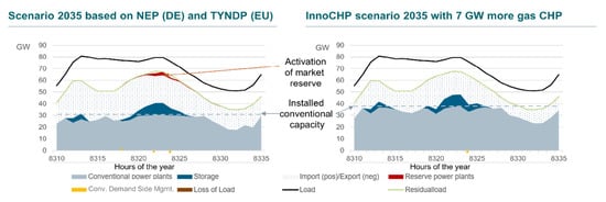 Comparison of hourly dispatch in base case (left) and InnoCHP scenario (right) for the year 2035. The red area shows the required amount of market reserve power plants. Residual load means electrical load minus non-dispatchable renewable generation.