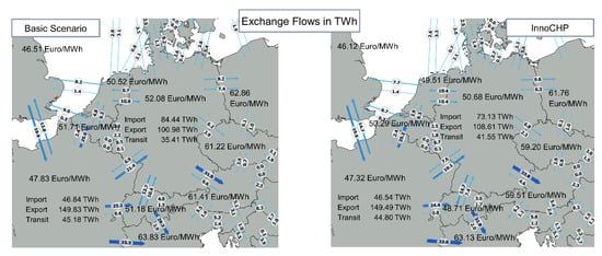 Another aspect indicating the security of supply of a country is the amount of energy that has to be imported. Again, there is a significant impact of adding innovative CHP solutions. Figure 7 on the left, compares the imports and exports to and from the neighboring countries for the base case. The results show an export of 101 TWh and an import of 84 TWh, resulting in Germany still being a net exporter of 17 TWh in 2035. The reason can be seen in the strong increase in renewable generation, especially the high amounts of wind power. When adding the CHP capacities, there will be a further increase in net export from 17 TWh to 36 TWh (109 TWh export vs. 73 TWh import). With the increased generation within Germany, the average electricity spot market price is reduced from 52 EUR/MWh in the base case to 50.7 EUR/MWh in the InnoCHP scenario.