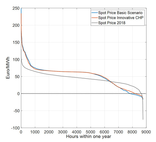 For a close look at the effects on electricity prices, Figure 8 shows the annual duration curve for both the base and the InnoCHP scenario. The following effects can be observed:
