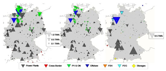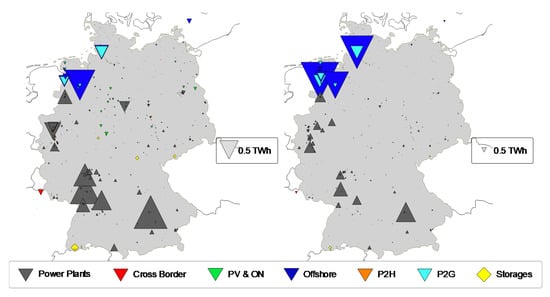 - Onshore–Offshore Shift (2035): Since the expansion of onshore wind is lagging official plans [30], this scenario includes 10 GW additional offshore wind units compared to the NEP B 2035 scenario. The capacities, producing an equivalent annual amount of energy as this 10 GW, are then subtracted from the installed wind onshore capacity. The power-to-gas capacity is adjusted to 6 GW by a separate energy system optimization of the German electricity system described in Section 2.2.7.