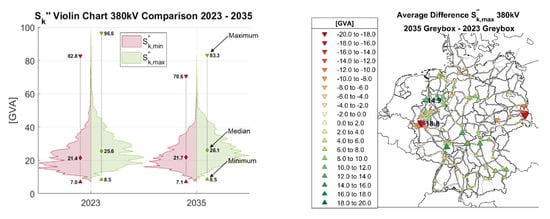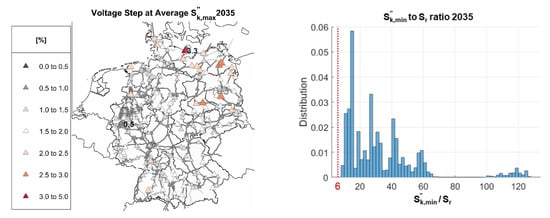 Short-circuit calculations are carried out to determine the subtransient short-circuit power Sk″ according to [39] and using the Takahashi method. To this end, the voltage magnitudes are assumed as 1 pu. The short-circuit power is used to evaluate both rotor angle and voltage stability according to [40]. Thus, rotor angle stability is assumed for each synchronous machine when the rated power of all synchronous machines connected to a bus complies with