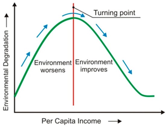 The already mentioned EKC hypothesis explains the connection between economic growth, most commonly expressed as GDP per capita, and the deterioration of the environment, most often expressed as CO2 emissions. Kuznets [39] originally developed the hypothesis of the existence of an inverted U-shaped linkage between income inequality and economic growth. Over time, environmental economists upgraded this original hypothesis into a new one, known as the EKC hypothesis, which emerged in the early 1990s with a study by Grossman and Krueger [40]. The model consists of the following—in the first phase of the GDP per capita growth, CO2 emission also increases to a certain level (turning point), and then, with the further growth in GDP per capita, CO2 emission starts decreasing, which is shown in the Figure 1. Until the turning point is reached, the economy of the country is pre-industrial, which means that the country is at a low-income level. After reaching the turning point, the economy of the country is characterized as industrial which means that it is at a middle-income level, and after that, the economy is post-industrial, that is, at a high-income level.