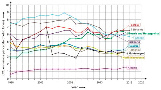 CO2 emissions per capita in ten Balkan countries (1998–2019) (Authors’ creation).
