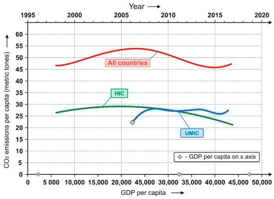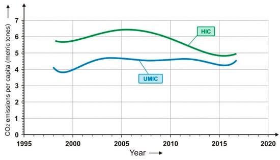 Average CO2 emissions per capita in HIC and UMIC groups (1998–2019) (Authors’ creation).