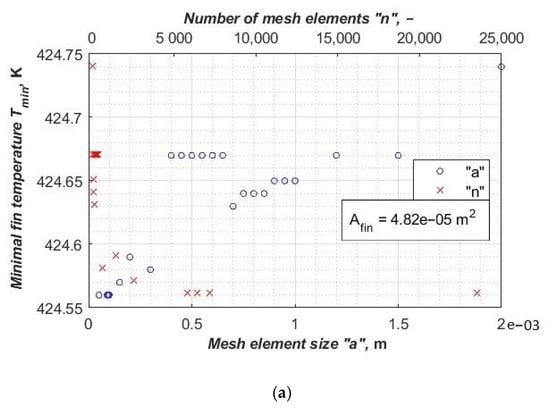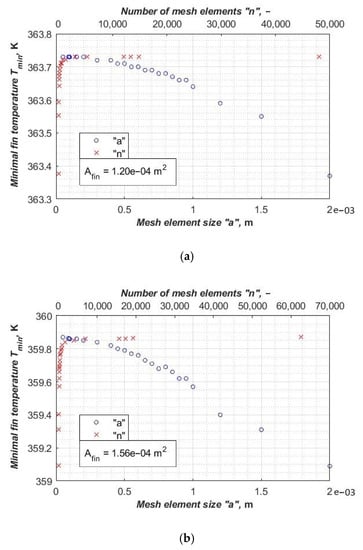 - An interesting relationship was noticed during the mesh element studies; the stable minimum temperature and constant fin efficiency occur for the maximum mesh element size of 3 × 10−4 m (ranging from 514 to 2005 mesh elements) for all presented simulations. Stable values of the fin efficiency changed slightly for a mesh element size between 3 × 10−4 m and 5 × 10−5 m (ranging from 514 to 72,184 mesh elements).