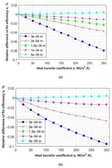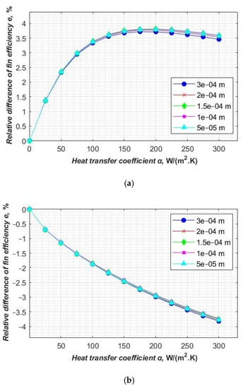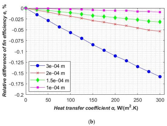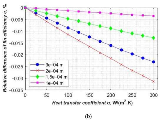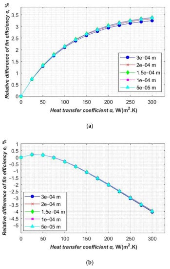 Figure 3 shows the relative differences between the numerical and analytical results for all of the mesh sizes mentioned above. It can be observed that the results are within the range +0.01%–0.1%, even for the least-dense mesh (element size 3 × 10−4 m—in the case of this element size, the straight and circular fin meshes consist of 1333 and 1736 elements, respectively). Those results are for the heat transfer coefficient ranging from 0 to 300 W/(m2·K) and for the mesh element size ranging from 3 × 10−4 m to 5 × 10−5 m (mesh elements ranging from 1333 to 48,000 elements for the straight fin and from 1736 to 62,512 elements for the circular fin). Additionally, it can be noticed that the relative differences become smaller for the higher number of mesh elements.