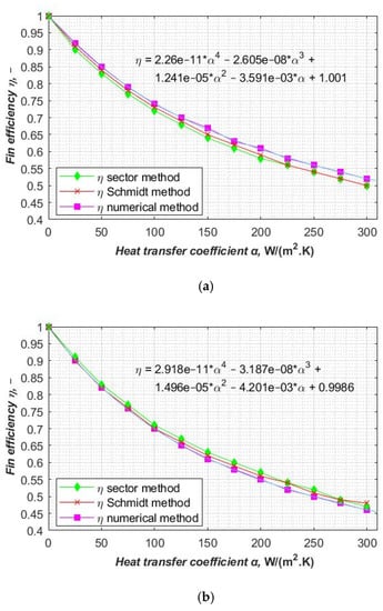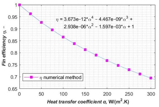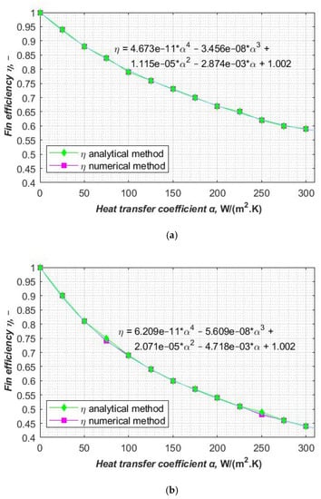 It can be noticed that the fin efficiency value for straight and circular fins for the numerical method is very close to the exact analytical result (Figure 4a,b). The fin efficiency (η), as a function of the heat transfer coefficient (α) on the air-side, is presented in Figure 4a for the straight fin and in Figure 4b for the circular fin.