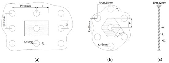 Virtual fin designation from the continuous fin: (a) rectangular imaginary fin for the parallel pipe arrangement, (b) hexagonal imaginary fin for the staggered pipe arrangement, (c) cross-section of fins (a) and (b).