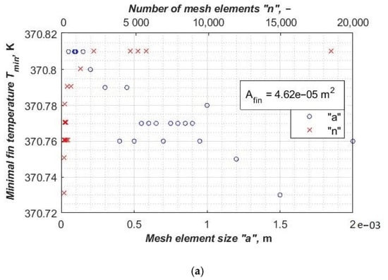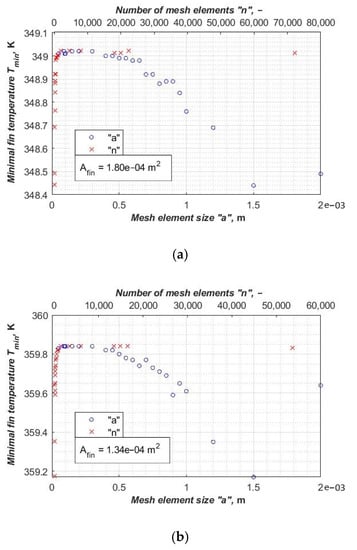 (a) The minimum fin temperature (for a heat transfer coefficient of 25 W/(m2·K)) as a function of the number of mesh elements and mesh element size. (b) Relative differences of fin efficiency between mesh element sizes 3 × 10−4 m, 2 × 10−4 m, 1.5 × 10−4 m and 1 × 10−4 m and mesh element size 5 × 10−5 m.