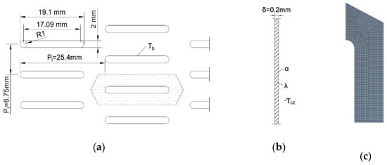 Plate-finned tube heat exchanger made of flattened pipes with a staggered pipe arrangement: (a) elongated hexagonal imaginary fin for the inline pipe arrangement analyzed in (Thulukkanam, 2013) [], (b) cross-section of the fin, (c) exemplary division into finite elements for a mesh element size of 3 × 10−4 m (514 mesh elements).