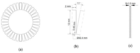 Finned surfaces are widely used, e.g., in electronic components, heating, cooling and ventilation systems, power plants and car radiators. The first references for calculating the effectiveness of finned surfaces were described by Harper and Brown [] in 1922. Up to this point, the calculations of the efficiency of fins with simple and complex shapes have been described several times. Bošnjaković et al. [] compare the analytical and numerical methods for annular fins. Jing et al. [] used the calculation of the fin efficiency of a serrated type of finned surface for more complicated research on the air–water heat exchanger for the data center. Nakhchi et al. [] used the calculation of the effectiveness of stepped fins’ area on the performance improvement of phase change thermal energy storage.